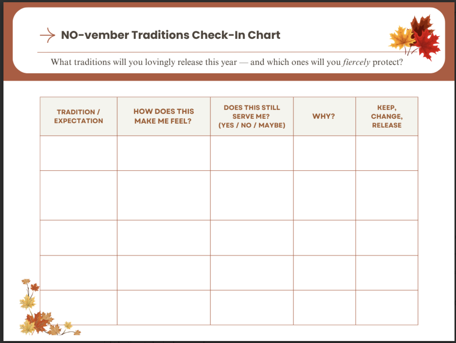 To help you figure out what to keep and what to release, I created the NO-vember “Traditions Check-In” Chart — a simple reflection tool to help you see which routines are adding joy… and which are only adding stress.