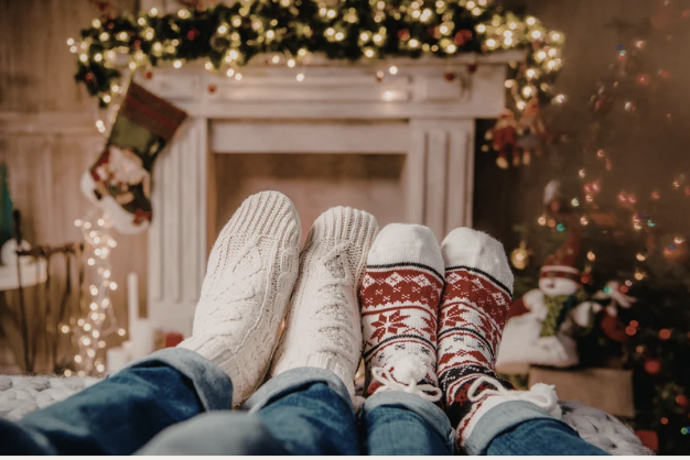 3. Cozy christmas feet in festive socks by a warm fireplace by Pop Andrea.